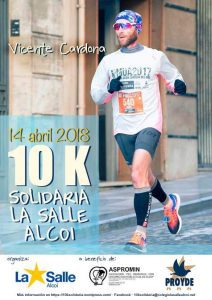 7 abril, 2018Será el próximo Sábado 14 de Abril a lo largo de toda la mañana. Habrá tres modalidades diferentes; una carrera infantil para niños menores de 14 años, otra para adultos y otra asistida para asegurarse de que todo el que quiera pueda participar. El precio de inscripción es de 8 euros la infantil y 10 euros la de adultos, aunque también hay un dorsal 0 a 5 euros para aquellos que no quieran correr pero sí participar en la colecta. Porque todo lo recaudado será para dos asociaciones: Aspromin, encargada de la gestión del centro Gormaget; y PROYDE, ONG de promoción y desarrollo vinculada a La Salle. Las inscripciones se pueden hacer mediante este enlace de mychip hasta el 11 de Abril. La carrera infantil comenzará a las 09:00 de la mañana, y se hará por tramos dependiendo de la edad del niño (como la San Silvestre), con un recorrido que pegará la vuelta al colegio. En cuanto a la 10K como tal, saldrá a las 10:30 desde el patio de La Salle, irá por la calle Periódico Ciudad hasta el IES Andreu Sempere, bajará a La Vía y desde aquí seguirá por las Paulas y el Romeral hasta los túneles de Batoy y la Vía Verde. Llegará un poco más allá del puente de las Siete Lunas, donde se cumplen los 5 kilómetros, y donde se hará el cambio de sentido para volver hasta La Salle. La vuelta irá por la misma calle hasta Isabel la Católica, donde se continuará por la calle de Caseta Mascarelles hasta el patio del colegio de nuevo. Atención, porque la carrera supondrá cortes de calles durante alrededor de una hora.Pero no se trata tan sólo de una 10K. La idea desde el colegio de La Salle es hacer una jornada deportiva, pero también lúdica y familiar. Por ello, a lo largo de la mañana habrá diferentes entretenimientos en el patio del colegio: hinchables, juegos infantiles, mercadillo, servicio de bar, música y más sorpresas. También habrá un contenedor donde la gente podrá dejar material escolar que el colegio recogerá para dar a las familias que lo necesitan. En definitiva, todas las facilidades para que no haya excusa para no colaborar, de una manera u otra, en esta actividad solidaria. Alex Olcina, maestro de La Salle, ha agradecido la implicación de las diversas empresas que colaboran así como la del Ayuntamiento de Alcoy para poder hacer una realidad esta carrera solidaria. Porque «la escuela tiene una labor educativa, claro, pero creemos que tenemos que ir un poco más allá y hacer también una labor social de cara al barrio y a la ciudad».Desde la concejalía de deportes el concejal Alberto Belda se mostró agradecido por la implicación de La Salle para poner en marcha una carrera más dentro del panorama de atletismo de la ciudad.