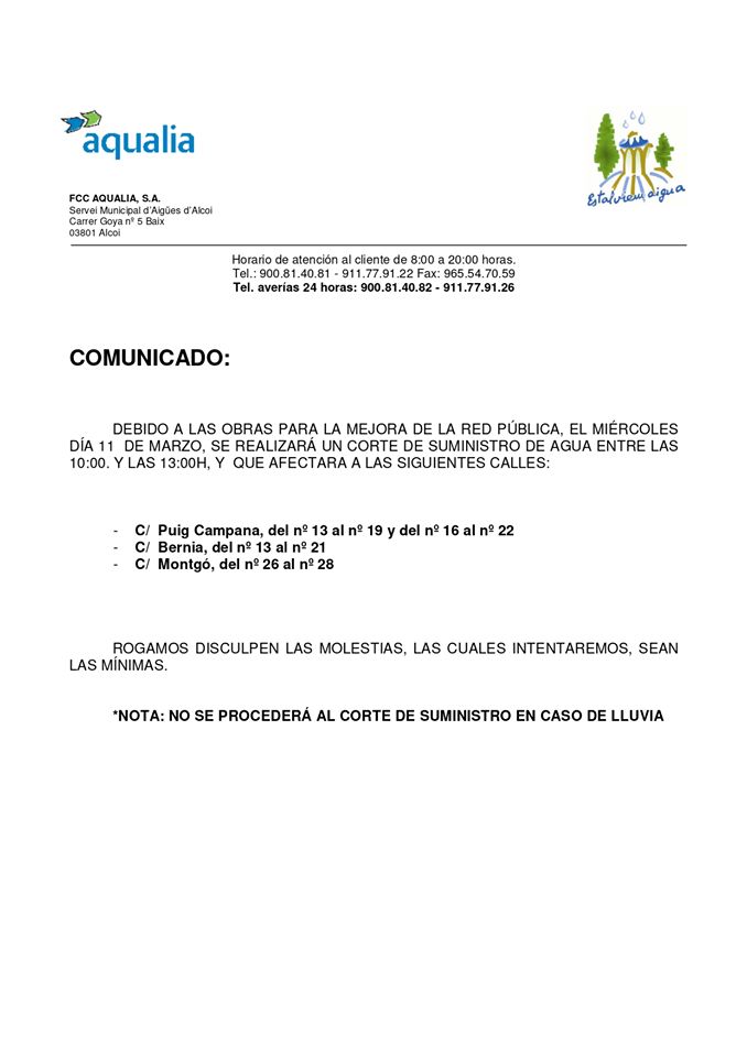 AQUALIA PROCEDERÁ A UN CORTE DE SUMINISTRO PARA LA MEJORA DE LA RED PÚBLICA