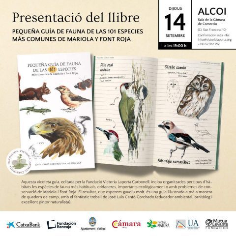 Guanyar denuncia que el PSOE està buidant la capacitat d’acció de l’Ajuntament d’Alcoi11 septiembre, 2023El Colegio de Enfermería de Alicante ofrece un curso online gratuito a la población de la provincia sobre “Cómo controlar la ansiedad y el estrés”11 septiembre, 2023 Acte de presentació del llibre «Pequeña guía de Fauna de las 101 especies más comunes de Mariola-Font Roja» 11 septiembre, 2023 Categorías OCIO Etiquetas exposición El proper dijous 14 de Setembre, a les 19.00 h, en la Sala de la Cambra de Comerç d’Alcoi, es presentarà el llibre: Pequeña guía de Fauna de las 101 especies más comunes de Mariola-Font Roja. Compartir Artículos relacionados26 noviembre, 2025El Campamento Real de Alcoy abre el plazo final de inscripción después de recibir más de 5.300 peticiones con el nuevo sistemaLeer más20 noviembre, 2025Inauguració de l’exposició «Fragmentos de lo que fuí» de Carlos MerchánLeer más Deja una respuesta Cancelar la respuestaTu dirección de correo electrónico no será publicada. Los campos obligatorios están marcados con *Comentario * Nombre * Correo electrónico * Web Guarda mi nombre, correo electrónico y web en este navegador para la próxima vez que comente. Δ