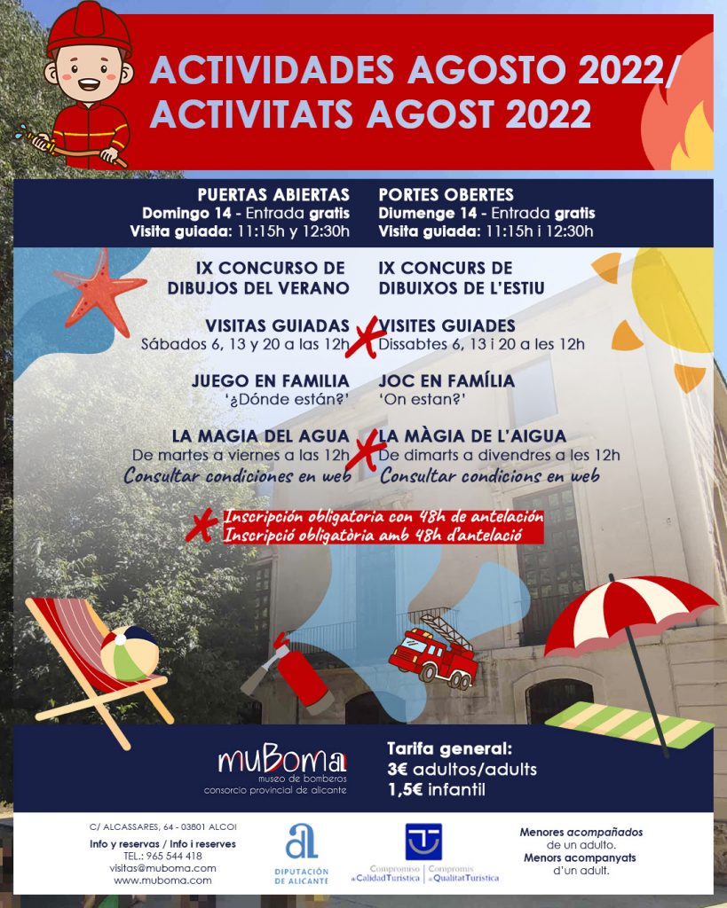 Continuarán con las VISITAS GUIADAS de los sábados a las 12h, serán los sábados 6, 13 y 20 de agosto. Durante todo el mes podréis jugar en familia a ¿DÓNDE ESTÁN? Un juego de pistas con el que podréis recorrer el museo libremente, aprendiendo y buscando pequeños detalles del MuBoma. Sigue también LA MAGIA DEL AGUA*, de martes a viernes a las 12h. Mínimo 4 personas para que la actividad se realice. Recomendada a partir de 6 años. Se aplicará la tarifa general del museo para LA MAGIA DEL AGUA y las VISITAS GUIADAS. Es obligatoria la inscripción con al menos 48h de antelación en días laborables. Los menores tendrán que ir acompañados de un adulto. Se seguirán las medidas sanitarias vigentes.