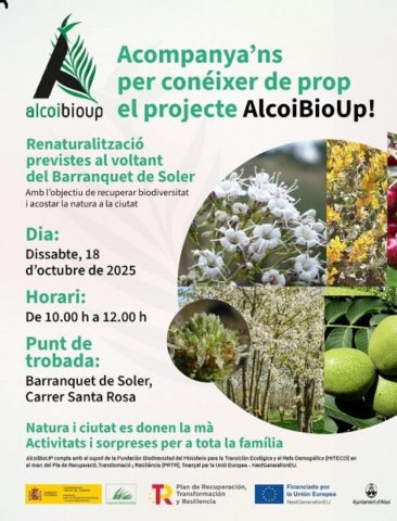 El Ayuntamiento de Alcoy celebrará este sábado 18 de octubre una jornada abierta a la ciudadanía para dar a conocer las actuaciones previstas en el Barranquet de Soler dentro del proyecto AlcoiBioUp!, una iniciativa impulsada con el apoyo de la Fundación Biodiversidad del Ministerio para la Transición Ecológica y el Reto Demográfico (MITECO) y financiada por la Fundación – NextGenerationEU.