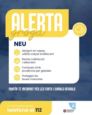 6 enero, 2026El Centro de Coordinación de Emergencias de la Generalitat Valenciana ha decretado la alerta amarilla por nieve que afecta al término municipal de Alcoy y a su entorno, ante la previsión de un episodio meteorológico adverso.