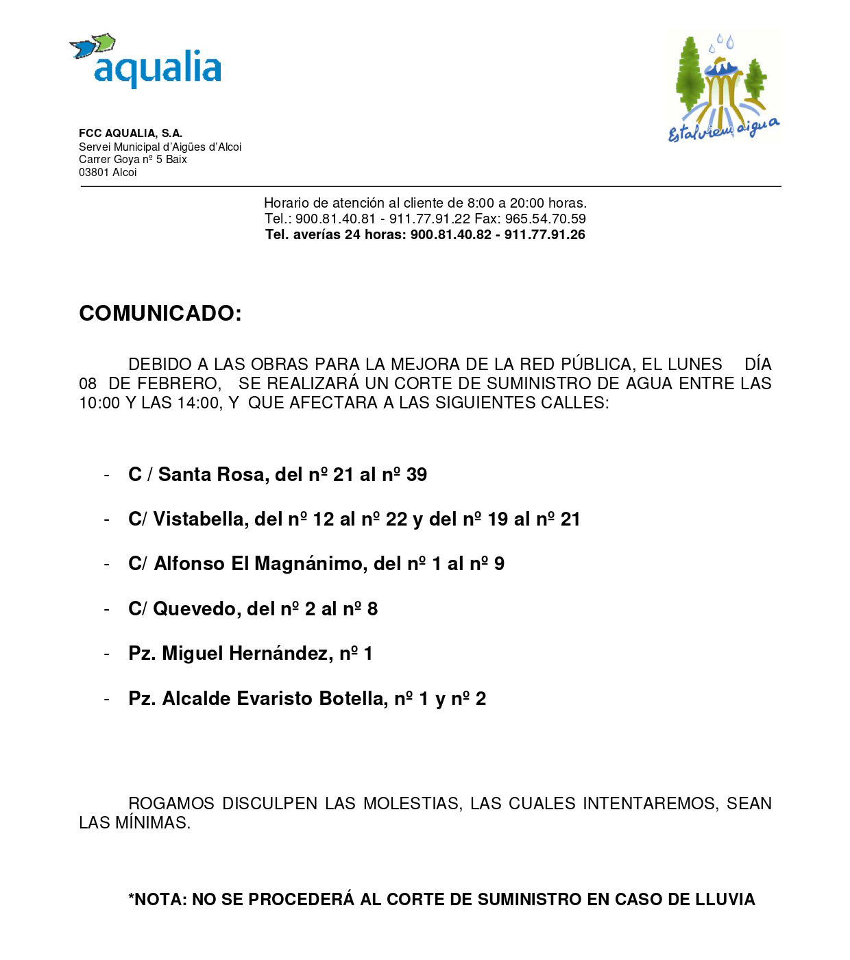8 febrero, 2021La empresa Aqualia S.A. informa que debido a las obras para la mejora de la red pública, hoy Lunes día 08 de Febrero se procederá a un corte de suministro de agua entre las 10:00 y las 14:00 horas en las siguientes direcciones: