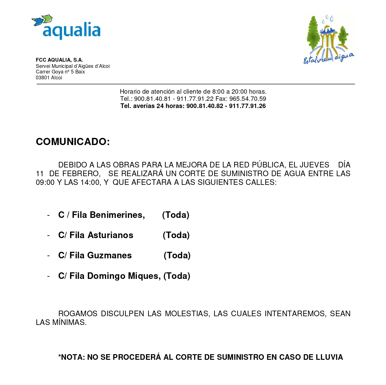 11 febrero, 2021La empresa Aqualia S.A. informa que debido a las obras para la mejora de la red pública, hoy Jueves día 11 de Febrero se procederá a un corte de suministro de agua entre las 09:00 y las 14:00 horas en las siguientes direcciones: