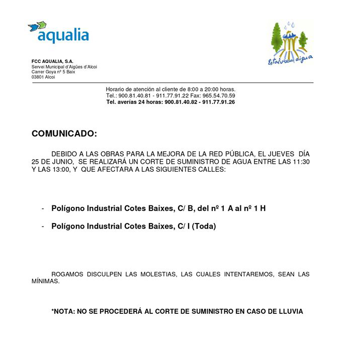 * Nota: En caso de lluvia no se procederá a dicho corte de suministro según la empresa.