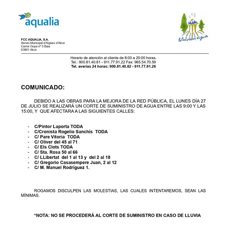 27 julio, 2020La empresa Aqualia S.A. informa que debido a las obras para la mejora de la red pública, hoy Lunes día 27 de Julio se procederá a un corte de suministro de agua entre las 09:00 y las 15:00 horas en las siguientes direcciones: