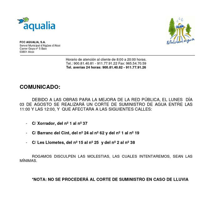* Nota: En caso de lluvia no se procederá a dicho corte de suministro según la empresa.