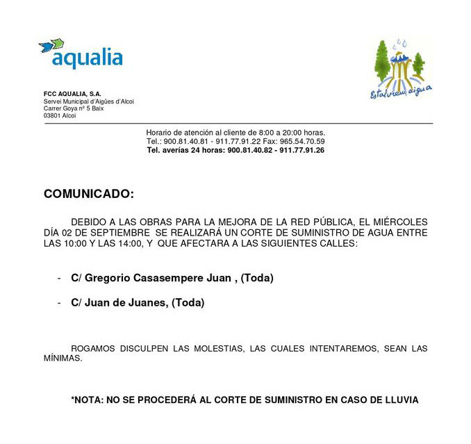 * Nota: En caso de lluvia no se procederá a dicho corte de suministro según la empresa.