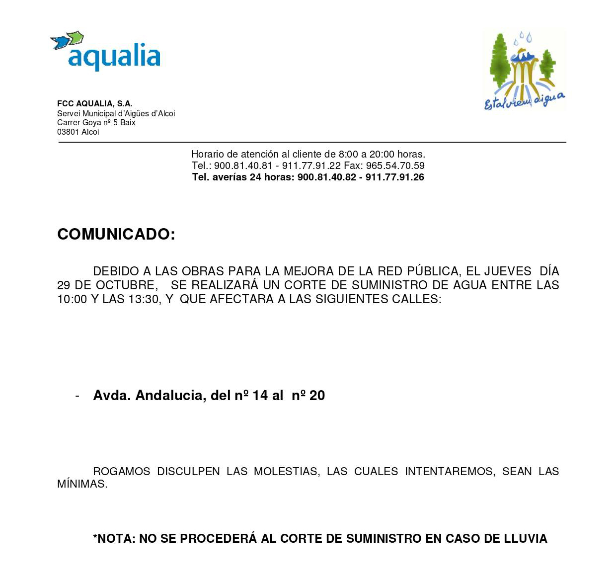 29 octubre, 2020La empresa Aqualia S.A. informa que debido a las obras para la mejora de la red pública, hoy Jueves día 29 de Octubre se procederá a un corte de suministro de agua entre las 10:00 y las 13:30 horas en la siguiente dirección: