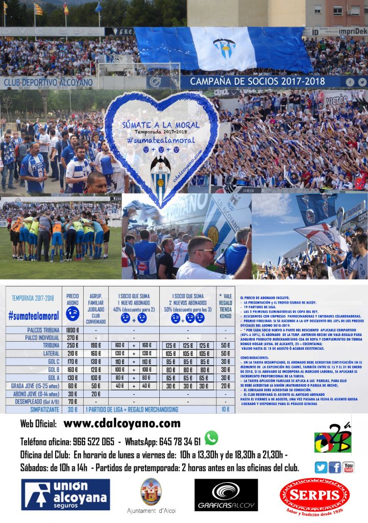 UBICACIÓN DE LES FILAES EN LA GLORIETA EN MIG ANY30 junio, 2017FINALIZADO EL PROYECTO DEL CAMPO DE LA VÍA DE COCENTAINA1 julio, 2017 CAMPAÑA DE SOCIOS DEL CD ALCOYANO PARA LA TEMPORADA 2017/2018 30 junio, 2017 Categorías DEPORTES Etiquetas Club Deportivo Alcoyano Aproximadamente sobre las 12:45 horas se ha dado a conocer la campaña de socios del Club Deportivo Alcoyano para la temporada 2017/2018 durante la rueda de prensa. A continuación os dejamos tanto las diferentes zonas del estadio como sus precios. Compartir Artículos relacionados26 noviembre, 2025Alcoy acoge el I Trofeo Ciudad de la Navidad de Ciclocross con la participación de cerca de 750 deportistas de ámbito nacionalLeer más23 noviembre, 2025Europa se resiste al PAS Alcoi: caída tras dos prórrogas y 16 penaltisLeer más Deja una respuesta Cancelar la respuestaTu dirección de correo electrónico no será publicada. Los campos obligatorios están marcados con *Comentario * Nombre * Correo electrónico * Web Guarda mi nombre, correo electrónico y web en este navegador para la próxima vez que comente. Δ
