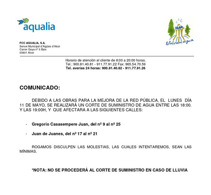 5 mayo, 2020 5 mayo, 2020Categorías LOCAL URBANISMOAQUALIA PROCEDERÁ A VARIOS CORTES DE SUMINISTRO PARA LA MEJORA DE LA RED PÚBLICALa empresa Aqualia S.A. informa que debido a las obras para la mejora de la red pública, hoy Martes día 05 de Mayo se procederá […]