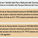 11 agosto, 2023Os informamos que ante la situación de ola de calor prevista para los próximos días de agosto 2023 y a la vista de las previsiones oficiales de situación de riesgo extremo de incendio forestal en el ámbito del Parque Natural del Carrascar de la Font Roja, el Consell de la Generalitat (resolución 09/08/2023) establece la restricción de accesos al parque natural mientras perdure la situación de riesgo extremo. Por lo cual, la barrera de acceso (km 0.8 de la CV-797) estará activada durante este periodo (10 al 15 de agosto).