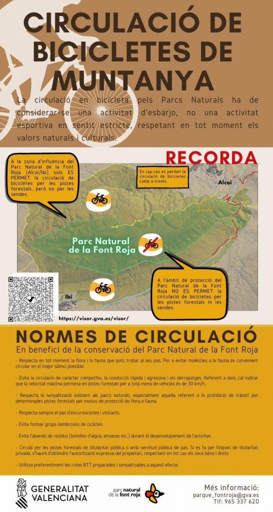En la imagen se puede ver la Circular informativa del Director Conservador de los Parques Naturales del Carrascal de la Font Roja y de la Serra de Mariola en relación con la normativa de regulación de bicicletas en el ámbito de dichos Parque Naturales.