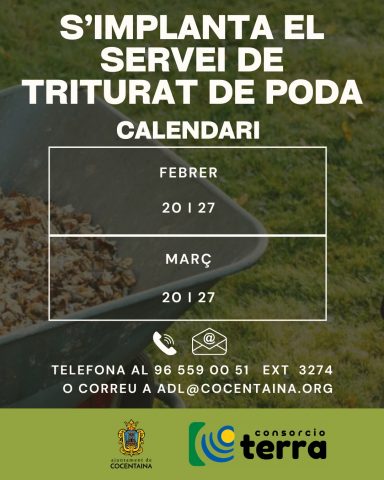 Pel que fa al calendari de triturat de poda, el servei començarà el 20 i 27 de febrer i el 20 i 27 de març. El servei s’ha de demanar telefonant al 96 559 00 51 en l’extensió 3274 o a través d’un correu electrònic a adl@cocentaina.org..