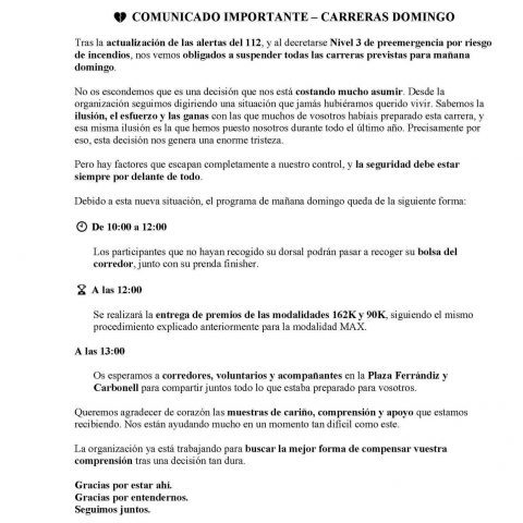 COMUNICADO OFICIAL – NEUTRALIZACIÓN DE LA CARRERA ULTRAMEDITERRANEA