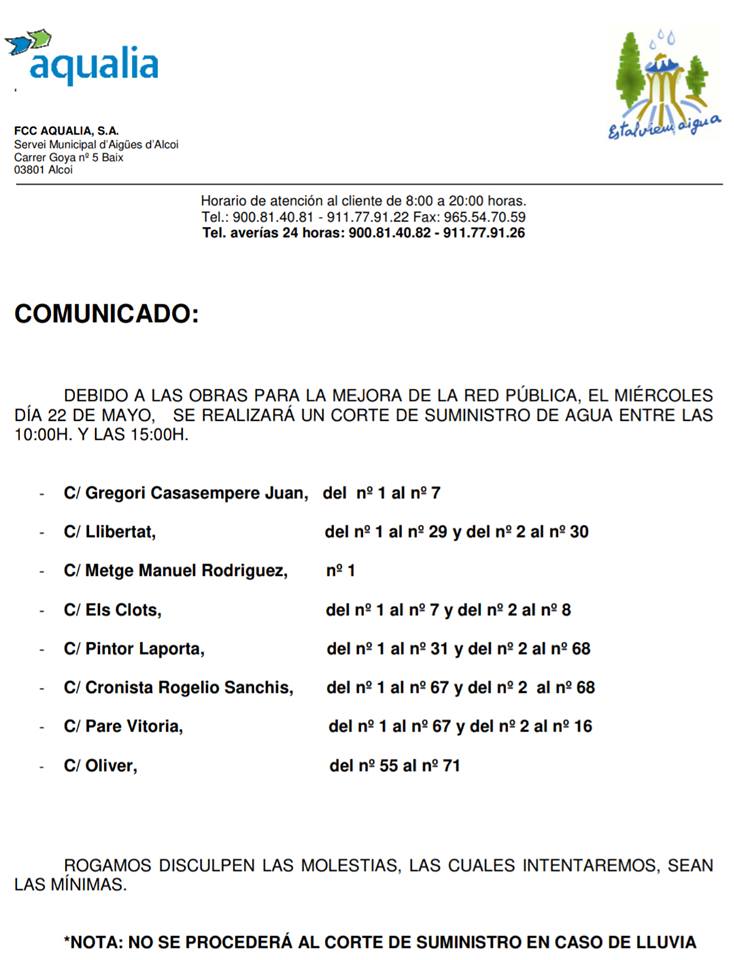 AQUALIA PROCEDERÁ A UN CORTE DE SUMINISTRO PARA LA MEJORA DE LA RED PÚBLICA