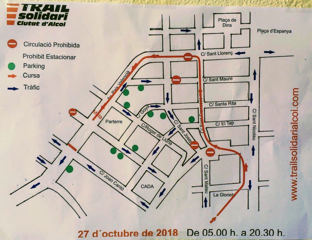 27 octubre, 2018Este Sábado 27 de Octubre a partir de las 08:00 horas de la mañana comenzará la sexta edición del Trail Solidari Alcoy y lo hará con record de participación, 1800 atletas participaran en un edición dedicada al medio ambiente y que tiene como fin la ayuda en la lucha contra el cáncer. A continuación os dejamos los cortes de tráfico que ha hecho públicos el Ayuntamiento de Alcoy con motivo del Trail Solidari Alcoy, facilitados por el Departamento de Movilidad y la Policía Local de Alcoy: