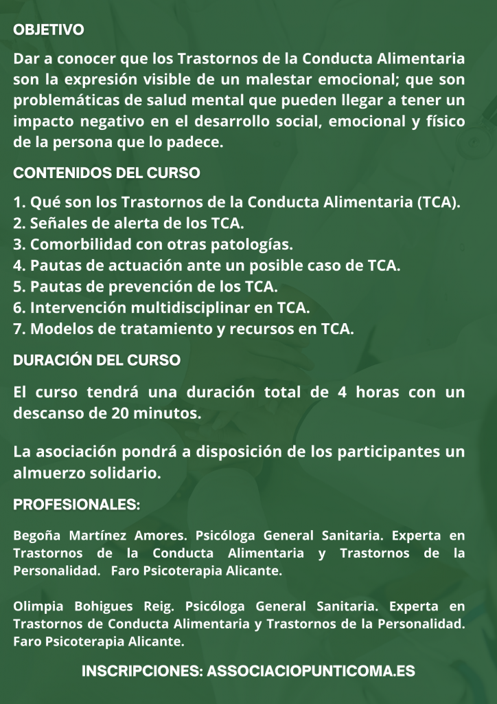 6 febrero, 2023Punt i Coma, la primera associació comarcal de l’Alcoià i el Comtat que lluita en contra dels trastorns de la conducta alimentària (anorèxia, bulímia…) que va ser constituïda fa menys de 6 mesos amb l’ajuda de l’obra social La Caixa i amb unes psicologes especialitzades amb el asunt (Olimpia i Begonya) impartirá un curs gratuït per a tot el personal sociosanitari.