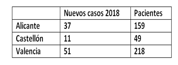 En la Comunidad Valenciana se calcula que hay alrededor de 426 enfermos de Esclerosis Lateral Amiotrófica y, durante 2018, se diagnosticaron aproximadamente 99 nuevos casos. Por provincias se deduce:
