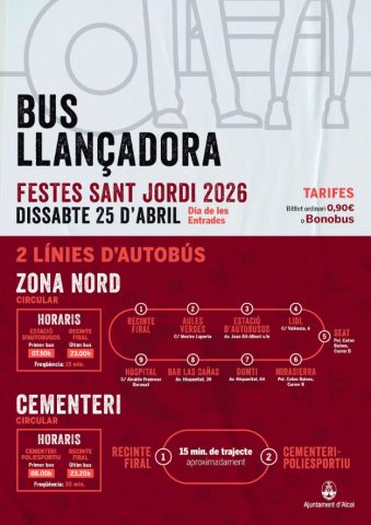 El servicio de lanzadera funcionará a pleno rendimiento el sábado 25 de abril, Día de las Entradas, a través de dos líneas circulares. La línea de la Zona Norte operará con una frecuencia de quince minutos, iniciando el servicio a las 07.50 horas y finalizando a las 23.00 horas. Este recorrido efectuará paradas en el Recinte Firal; Aules Verdes en la calle Mestre Laporta; la Estació d’Autobusos en la avenida Joan Gil-Albert; Lidl en la calle València, 4; Seat y Mirasierra en la calle B del polígono Cotes Baixes; Domti en la avenida Hispanitat, 64; Bar Las Cañas en la avenida Hispanitat, 39, y el Hospital en la calle Alcalde Francesc Boronat. Por otro lado, la línea circular del Cementerio tendrá una frecuencia de treinta minutos, con salidas ininterrumpidas desde las 08.00 horas hasta las 23.20 horas. Esta ruta conectará el Recinte Firal con el Cementeri-Poliesportiu, completando el trayecto en aproximadamente quince minutos.