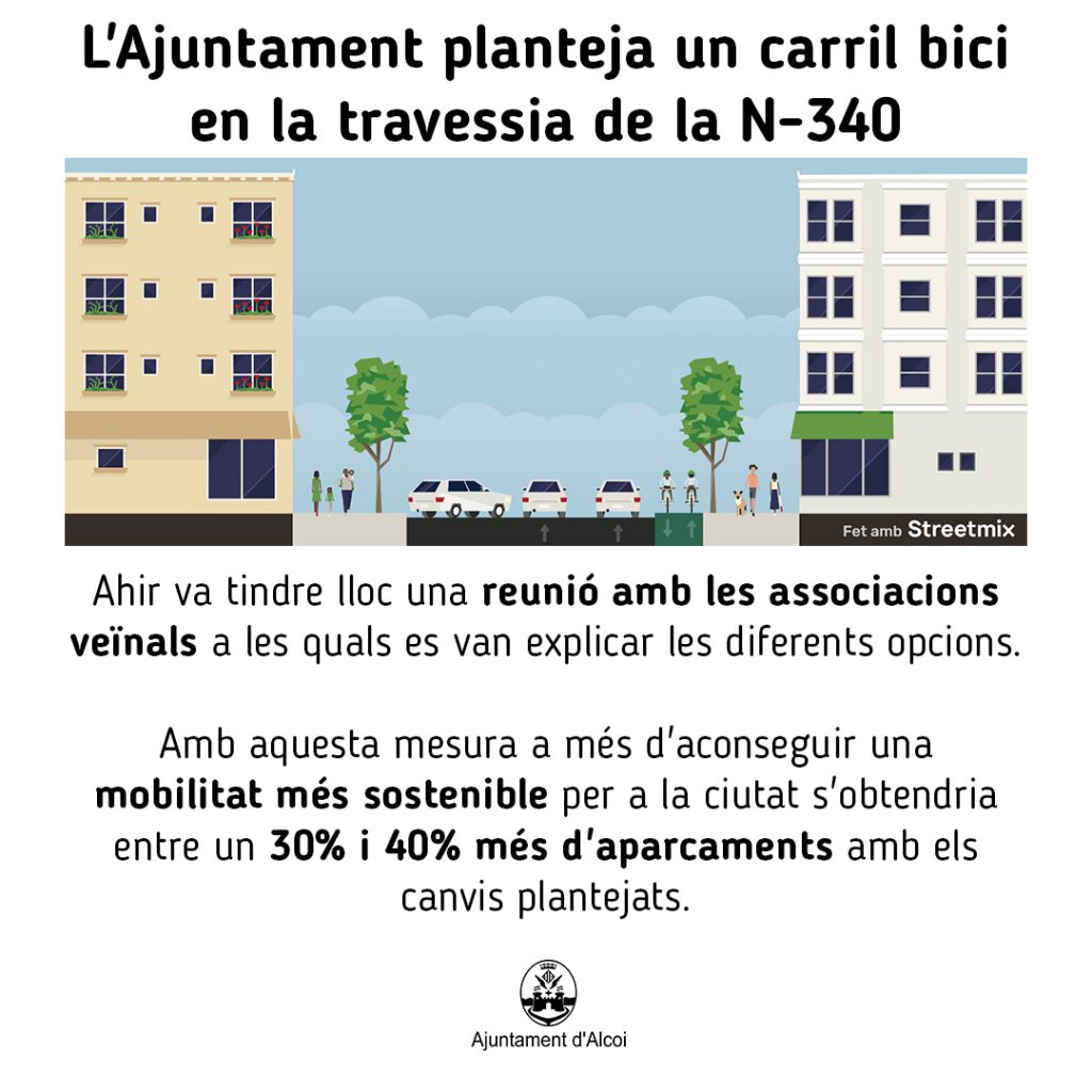 17 marzo, 2021El Ayuntamiento de Alcoy tiene previsto la instalación de un carril bici que una el Puente de María Cristina con la nueva rotonda de acceso Norte atravesando, Els Alçamora, Alameda Camilo Sesto, Juan Gil Albert i calle València. Esta medida ya se anunció en el pleno del pasado mes de septiembre y podrá ser llevada a cabo cuando la travesía de la Nacional 340 a su paso por nuestra ciudad sea asumida por el Consistorio, lo que se tratará en los próximos días en un pleno Municipal. El proyecto contempla una reordenación de los aparcamientos pasando a ser en batería lo que propiciará un aumento del número de plazas de entre un 30 y un 40%.