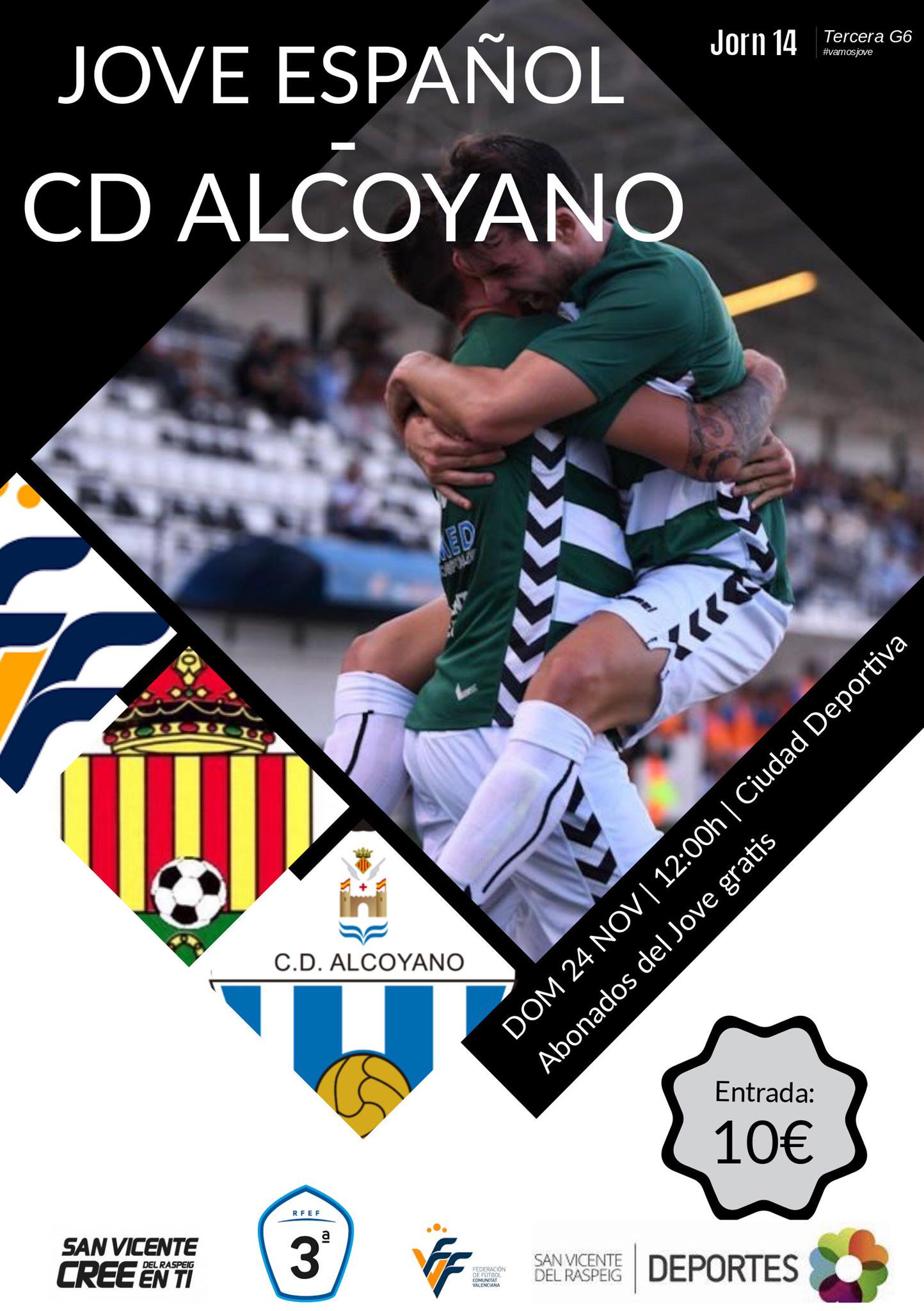 24 noviembre, 2019El Club Deportivo Alcoyano disputará en sesión matinal la decimocuarta jornada del campeonato liguero y lo hará nuevamente como visitante. El encuentro dará comienzo a partir de las 12:00 horas en la Ciudad Deportiva de San Vicente ante el Jove Español y será dirigido por el colegiado Jorge Denis Monterde Gracia ayudado en las bandas por los asistentes Jose Carlos Casanova Garcia Casarrubios y Francisco Latorre Pareja.