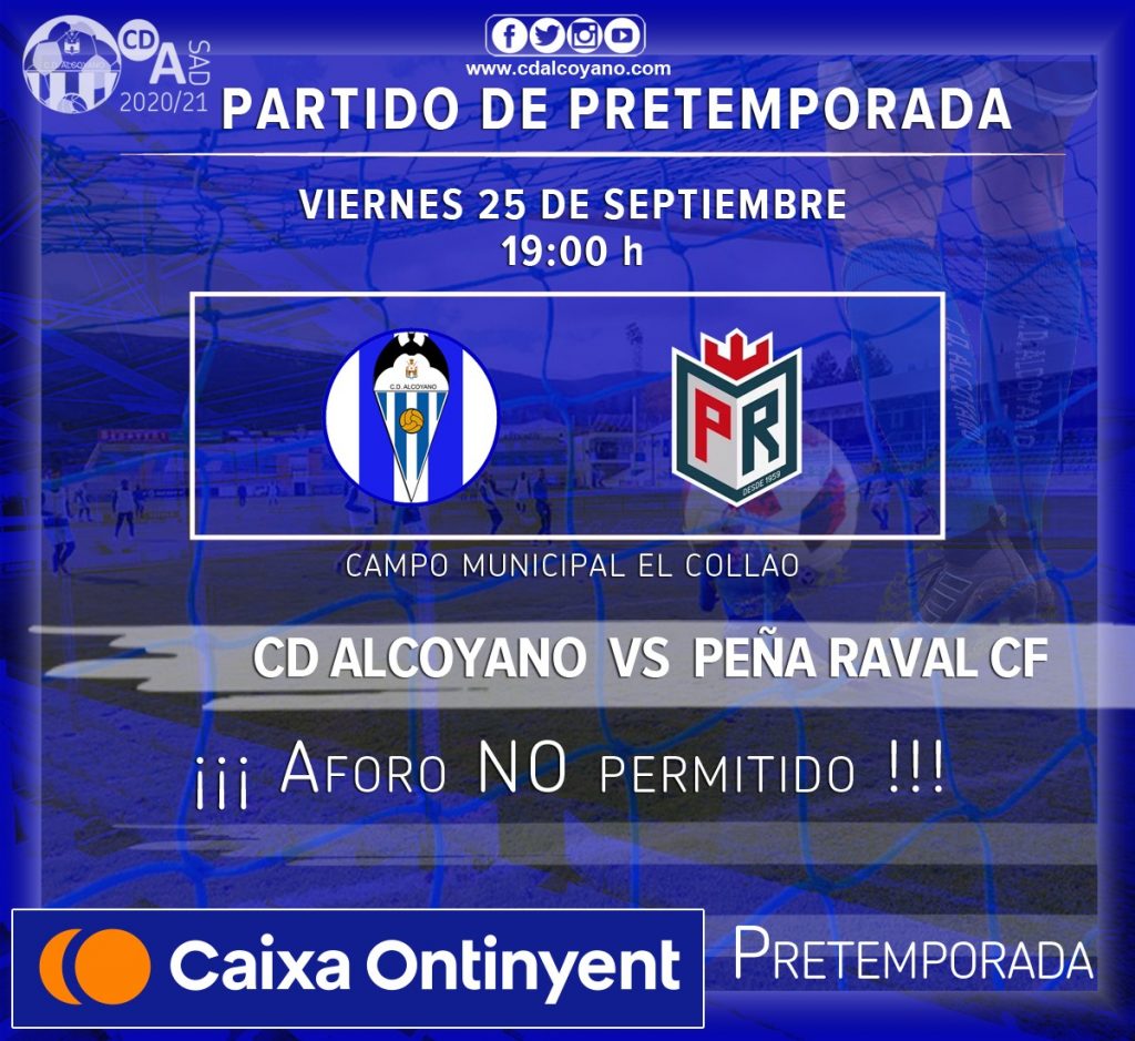 25 septiembre, 2020El Club Deportivo Alcoyano SAD jugará esta tarde Viernes 25 de Septiembre un nuevo amistoso de pretemporada, en este caso se jugará a puerta cerrada en el Campo Municipal El Collao. El encuentro dará comienzo a partir de las 19:00 horas ante la Peña Raval Elche CF, ya que el partido que se tenía previsto ante el conjunto madrileño del Flat Earth FC ha sido cancelado debido a la seguridad de todos los componentes de ambos equipos con motivo del Coronavirus.