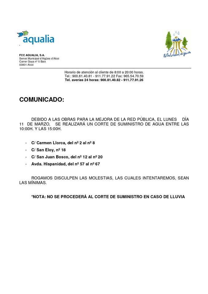 AQUALIA PROCEDERÁ A UN CORTE DE SUMINISTRO PARA LA MEJORA DE LA RED PÚBLICA