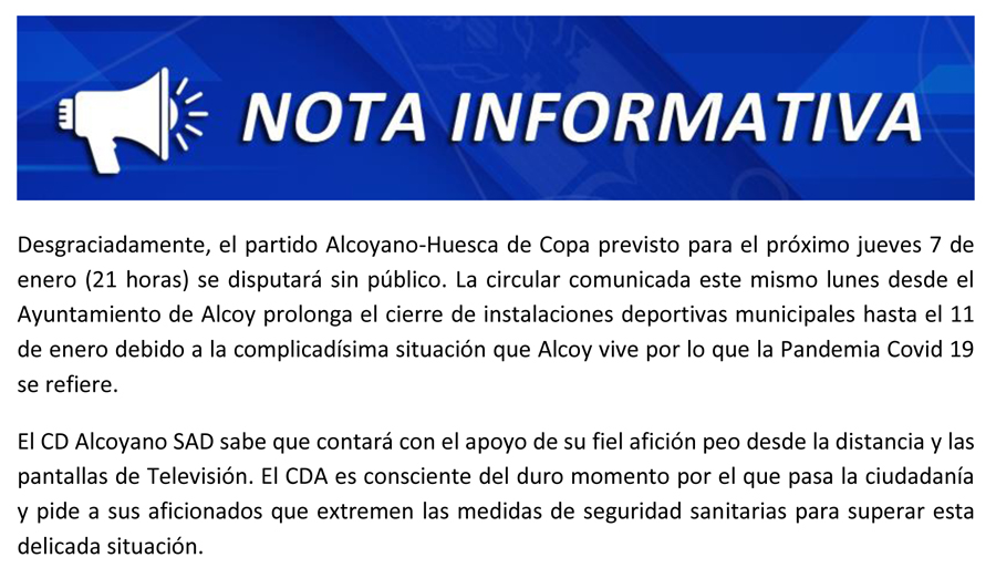 5 enero, 2021Desgraciadamente, el partido entre el Club Deportivo Alcoyano SAD y la Sociedad Deportiva Huesca de Copa del Rey previsto para este próximo Jueves 07 de Enero a partir de las 21:00 horas finalmente se disputará sin público en las gradas. La circular comunicada este mismo Lunes por parte del Ayuntamiento de Alcoy en la cual prolonga el cierre de las instalaciones deportivas municipales hasta el próximo 11 de Enero debido a la complicadísima situación que Alcoy vive por la pandemia del Covid-19 hace que la afición alcoyanista no pueda acceder al Campo Municipal El Collao para presenciar este importante encuentro.