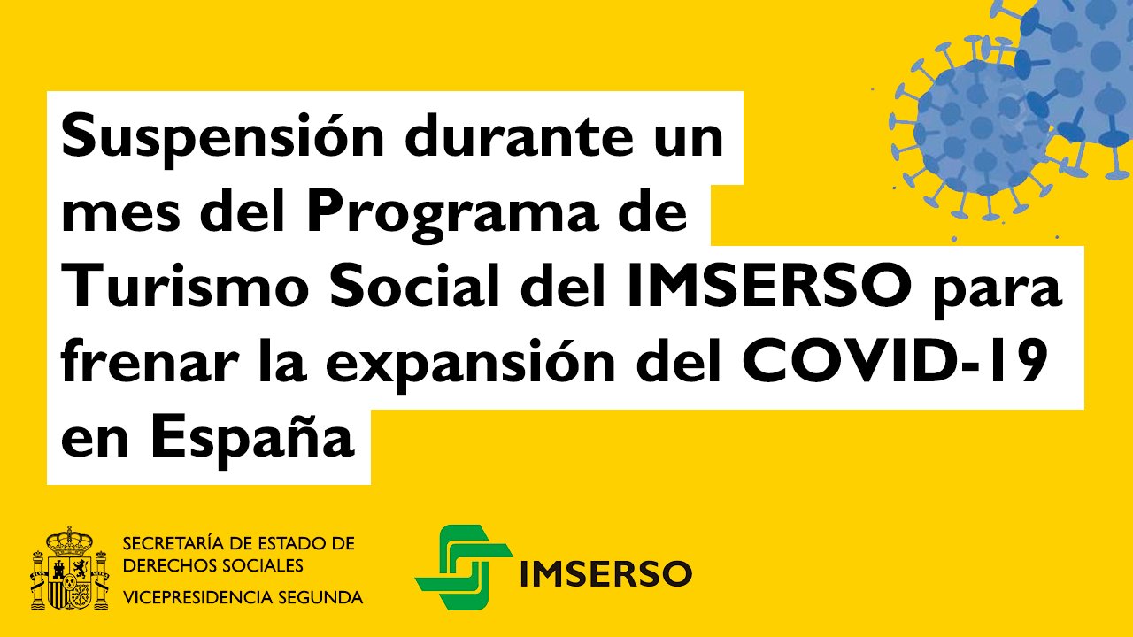 11 marzo, 2020El Consejo de Ministros aprobó este Martes la suspensión de todos los viajes del programa de Turismo Social del Imserso durante un mes ante la expansión del brote de coronavirus, en el que las personas mayores forman parte del grupo de riesgo.