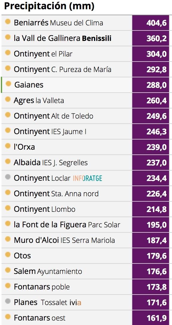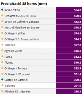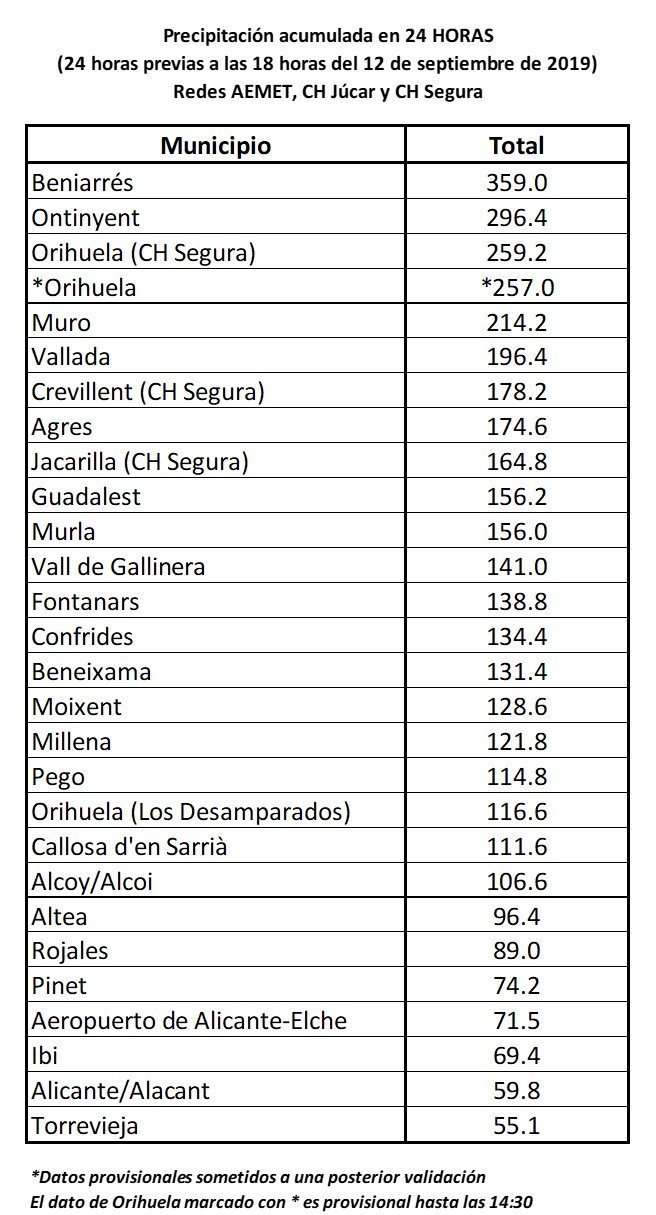 13 septiembre, 2019Esta es la precipitación acumulada según diferentes fuentes, las ciudades cercanas más afectadas han sido Ontinyent y Orihuela. El río Clariano se desbordó rápidamente el jueves y se tuvieron que desalojar a vecinos de la Cantereria, mientras que hoy viernes hay riesgo de que el río Segura se desborde.