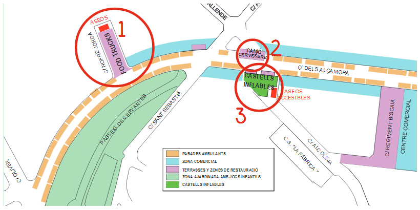 – Zona de castillos hinchables al final de la calle Alcoleja (Centro de Salud La Fábrica) con monitores.