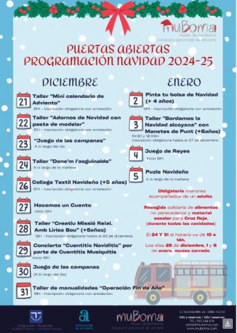 En cuanto a los talleres didácticos (con inscripción obligatoria) os ofrecemos un amplio abanico para diferentes edades: haremos un calendario de adviento, adornos navideños, cestitas para recibir el popular “asguinaldo”, paisajes de collage, prepararemos la Nochevieja o haremos un puzle o pintaremos una tote bag. Entre todos ellos destacan el sábado 28, con un taller creativo impartido por la ilustradora Lirios Bou “Missió Reial” y el día 3, Manetes de Punt nos enseñará a bordar un personaje de la Navidad alcoyana. En la página web encontraréis toda la información detallada, la edad recomendad y el plazo de inscripción.