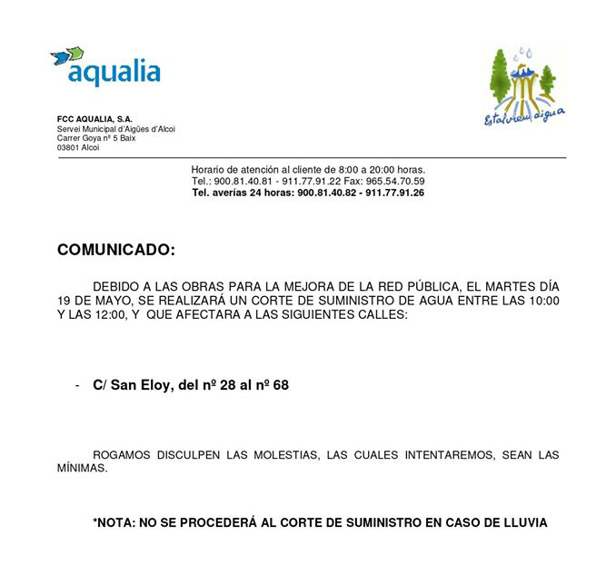 AQUALIA PROCEDERÁ A UN CORTE DE SUMINISTRO PARA LA MEJORA DE LA RED PÚBLICA
