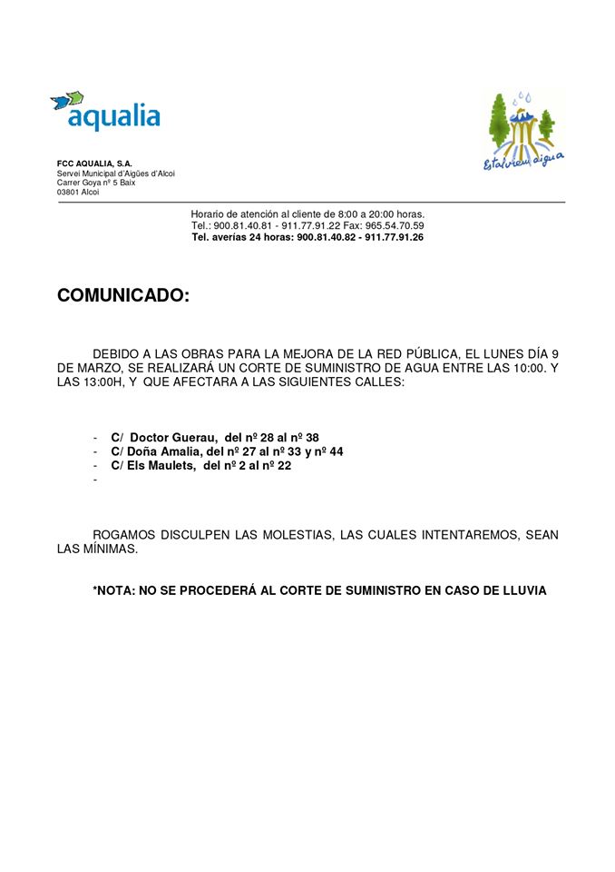 AQUALIA PROCEDERÁ A UN CORTE DE SUMINISTRO PARA LA MEJORA DE LA RED PÚBLICA