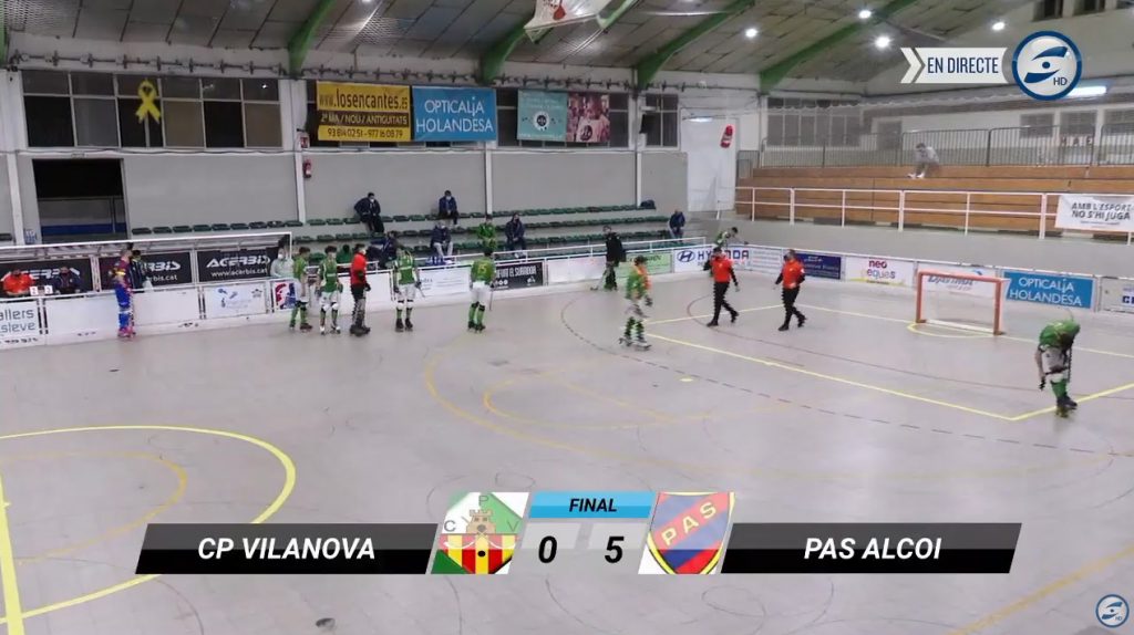 Los jugadores de Lorenzo Pastor no querían verse sorprendidos por el conjunto catalán, actualmente penúltimo clasificado, por lo que saltaron al pabellón concentrados y con el propósito de resolver el choque cuanto antes. Fue Aleix Pastor quien abrió el marcador en el minuto 6, instantes después Gonzalo Pérez anotaba el segundo de penalti para dar tranquilidad al equipo alcoyano. Aunque el CP Vilanova lo intentaba cuando disponía de la bola tanto en jugadas como en lanzamientos desde fuera del área no podía batir a Marc Grau «Guiri» que dejó su portería a cero. Con el paso de los minutos el Patín Alcodiam Salesiano volvía a poner tierra de por medio con otro gol de Aleix Pastor antes de marcharse a los vestuarios tras la finalización de la primera parte.