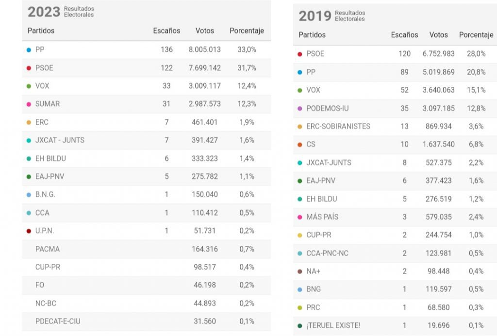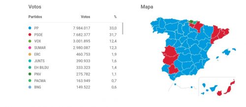 24 julio, 2023El Partido Popular ha ganado las Elecciones Generales aunque no tiene suficiente votos para Gobernar el país ni con el apoyo de Vox. Con el 99,5% del escrutinio realizado, el Partido Popular aumenta de 89 a 136 escaños tquedandose a 40 de la mayoria absoluta de 176 escaños. Por su parte Vox ha disminuido de 52 a 33 escaños y la suma de los dos partidos no llegaria a la mayoria. Por su parte el PSOE ha aumentado de 120 a 122 escaños y Sumar ha llegado solo a 31 escaño, por lo que aun sumando los dos partidos, les faltarian 13 escaños para llegar a la mayoria.