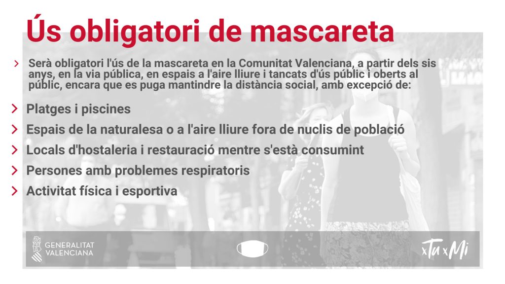 La Generalitat establece a partir de este Sábado 18 de Julio el uso obligatorio de las mascarillas, independientemente de que además se guarde la distancia interpersonal de seguridad de metro y medio, «en todo momento en la vía pública», en espacios al aire libre, espacios cerrados de uso público o abiertos al público. «No es que haya una alternativa, mascarilla o distancia, es que tendrá que haber distanciamiento y mascarillas», ha puntualizado. También ha recalcado que su uso «se recomienda también» en espacios privados, abiertos o cerrados, «cuando exista confluencia con personas no convivientes o no pueda garantizarse la distancia interpersonal».