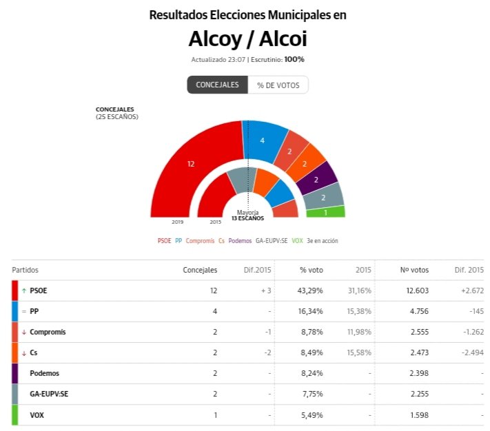 27 mayo, 2019En las elecciones europeas y locales celebradas el 26 de mayo, había 46.298 alcoyanas llamados a votar, donde se obtuvo una participación del 63.36%. El ellas el PSOE de Toni Frances seguirá siendo la primera fuerza política de Alcoy, aumentando de 9 a 12 concejales, tras ganar 2.672 votos más que en los comicios de 2015.