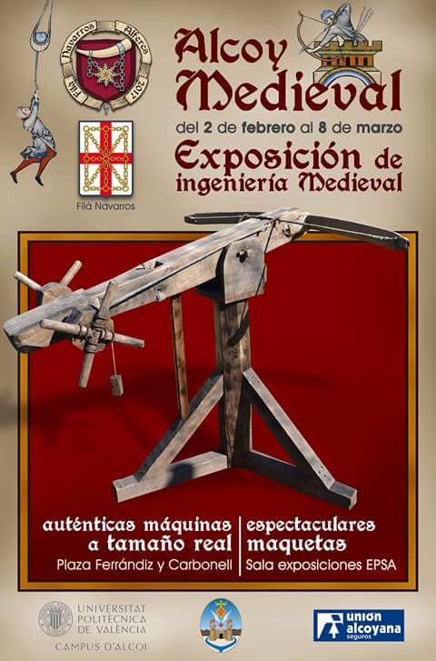 La Alferecía de la Filà Navarros presenta Alcoy Medieval, un conjunto de actividades sobre el mundo medieval y que comienza con una espectacular exposición de maquetas de auténticas maquinas a tamaño real. La exposición tendrá lugar en la sala exposiciones de la EPSA del 2 de febrero al 8 de marzo.
