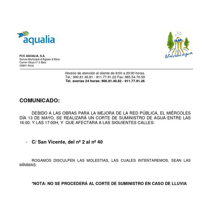 AQUALIA PROCEDERÁ A UN CORTE DE SUMINISTRO PARA LA MEJORA DE LA RED PÚBLICA