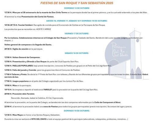 El PAS Alcoi se impone al CP Voltregà en un partido de alto nivel11 octubre, 2025Alcoyano no pasa del empate ante el Poblense en El Collao12 octubre, 2025 FIESTAS DE SAN ROQUE Y SAN SEBASTIÁN 2025 12 octubre, 2025 Categorías OCIO Etiquetas Hoy domingo 12 de octubre, empieza ya el primer acto de las fiestas de San Roque y San Sebastián del 2025. Compartir Artículos relacionados15 octubre, 2025Jornada de Puertas Abiertas y Marcha de los Animales de la Protectora de Animales de AlcoiLeer más15 octubre, 2025Últimos preparativos para el Sound Jordi 2025: horarios, bus gratuito para volver y otros serviciosLeer más Deja una respuesta Cancelar la respuestaTu dirección de correo electrónico no será publicada. Los campos obligatorios están marcados con *Comentario * Nombre * Correo electrónico * Web Guarda mi nombre, correo electrónico y web en este navegador para la próxima vez que comente. Δ