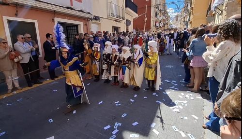 La jornada comenzó a las 8:30 h con la tradicional «Misa de Glorierets» en la Parroquia de Santa María, donde varios participantes tomaron su Primera Comunión. A las 12:00 h, desde El Partidor, se inició el desfile encabezado por los heraldos y trompeteros, seguido por los representantes de los bandos moro y cristiano. El recorrido incluyó calles emblemáticas como San Nicolás y la Plaza de España, finalizando en la Iglesia de San Jorge .