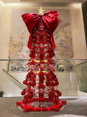 El árbol, bautizado como «Caprile by Erum», representa la globalidad y la sostenibilidad a través de la economía circular. Está fabricado con perchas recicladas, que representan el compromiso del Grupo Erum, y la moda, con el planeta.