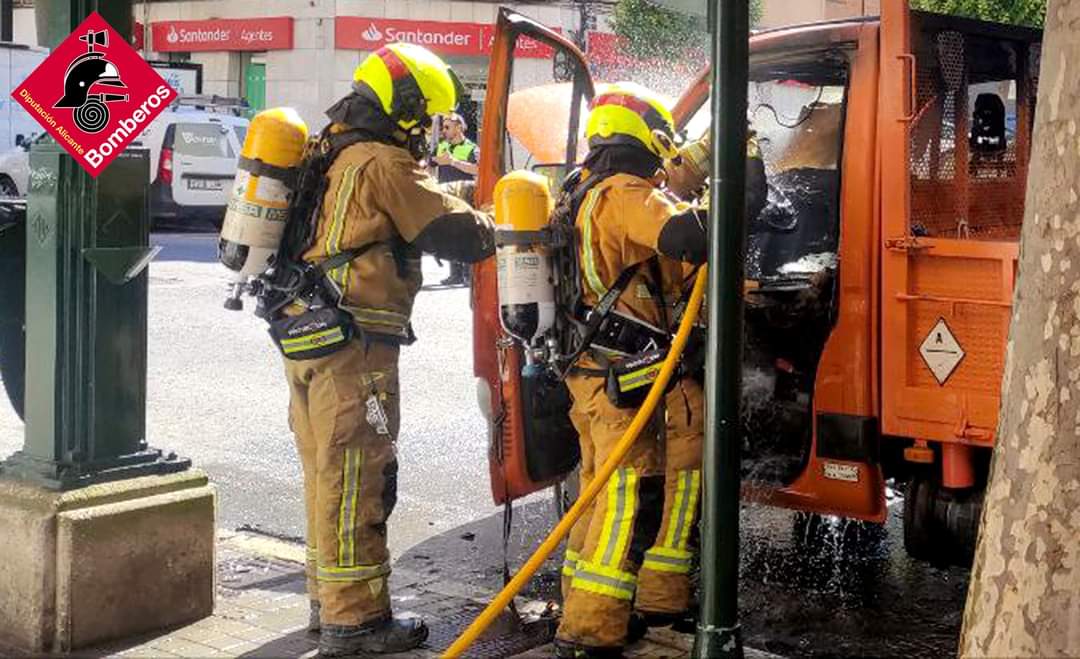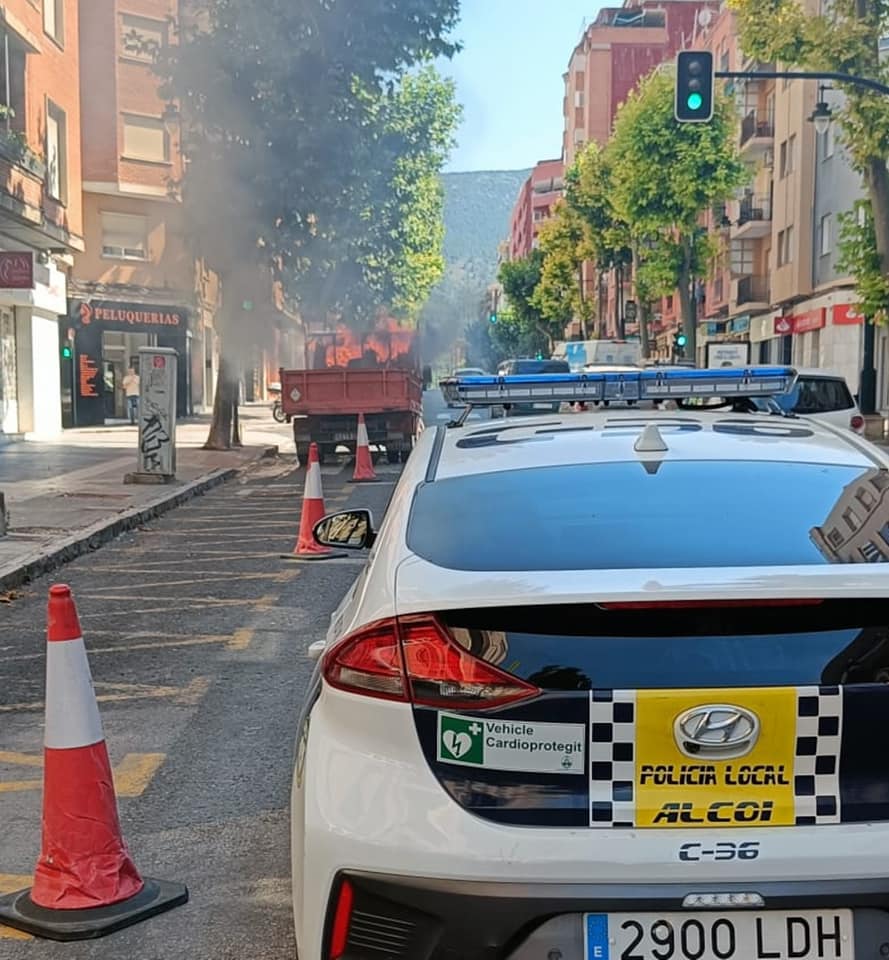 Efectius de la Policia Local d’Alcoi han intervengut junt amb efectius del parc provincial de bombers amb motiu d’incendi en vehicle al carrer Santa Rosa. Els ocupants estan il·lesos, només veient-se afectat el vehicle. Els bombers van sofocar un incendio en la cabina de un camión de 3.500 kg.