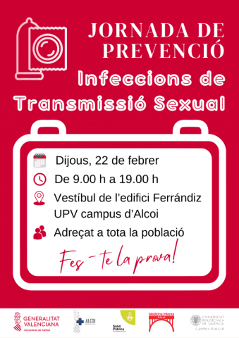 Tindrà lloc el pròxim dijous 22 de febrer en el vestíbul de l’edifici Ferràndiz de la UPV, entre les 9 h i les 19 h. El regidor de Salut Pública, Carles Sansalvador, ha comunicat que, per a aquest dijous, s’ha organitzat una jornada de prevenció d’infeccions de transmissió sexual. Amb aquesta jornada es pretén facilitar, tant la realització de proves ràpides com l’accés a la informació al respecte, amb tests d’ITS gratuïts i confidencials i amb taules informatives. Tindrà lloc el pròxim dijous 22 de febrer al vestíbul de l’edifici Ferràndiz de la UPV, entre les 9 h i les 19 h, i es realitzarà amb la col·laboració del Departament de Salut i de la UPV. Sansalvador ha animat a acudir a aquesta jornada «per crear consciència sobre la importància de la salut sexual i controlar la nostra salut».