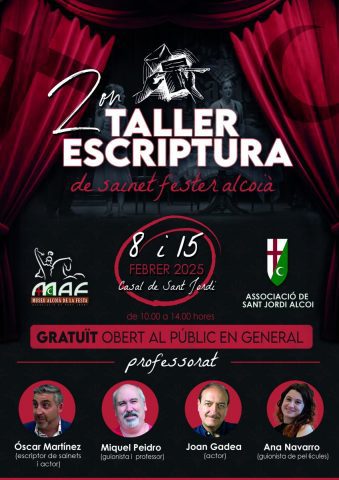 23 enero, 2025L’Associació de Sant Jordi, amb la finalitat de promoure i motivar l’escriptura del Sainet Fester Alcoià, i amb l’èxit de l’edició passada, obri el segon taller gratuït dirigit a tots els públics.