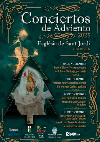 24 noviembre, 2025La Associació de Sant Jordi inicia un año más el tradicional ciclo de Conciertos de Adviento, una cita cultural profundamente arraigada en la ciudad y que marca el comienzo del tiempo litúrgico previo a la Navidad. Los conciertos se celebrarán todos los domingos del 30 de noviembre y 7, 14 y 21 de diciembre, siempre a las 10:30 h, en la Iglesia de San Jorge, templo del patrón de Alcoy y escenario habitual de esta propuesta musical.