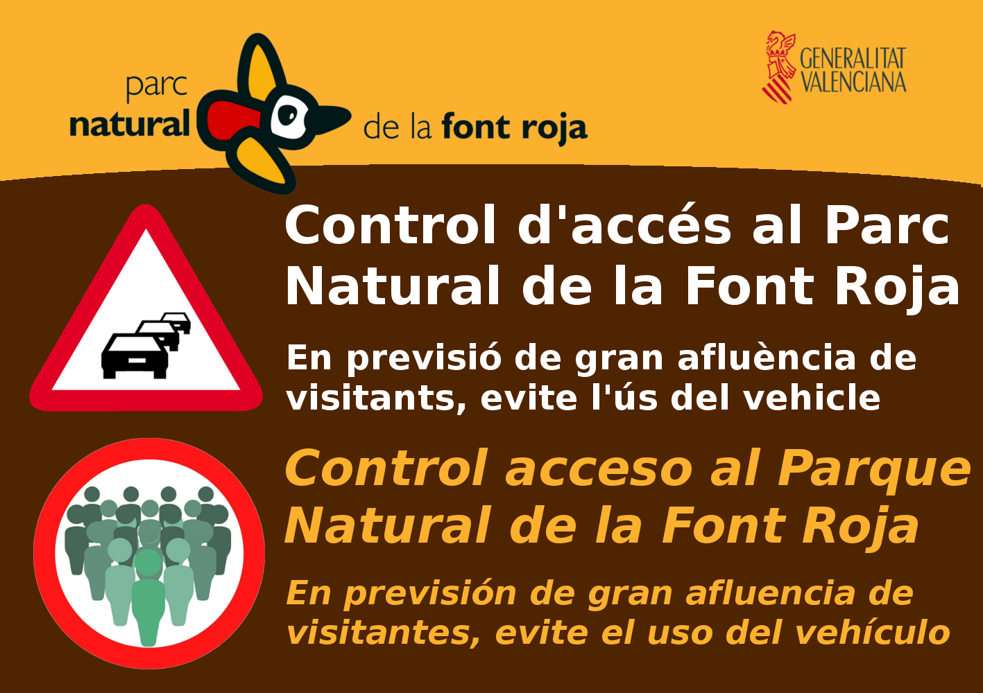 8 octubre, 2020Teniendo en cuenta la previsión de una afluencia masiva de visitantes durante los días 09, 10, 11 y 12 de Octubre, así como en los meses de otoño, y con el fin de garantizar la seguridad del visitante y minimizar impactos sobre el entorno, la Dirección del Parque Natural de la Font Roja recomienda evitar el acceso con vehículo motorizado al ámbito del Parque Natural, especialmente a la zona del Santuario. En caso de acceder, respete la señalización existente y las recomendaciones del personal del Parque y agentes de tráfico.