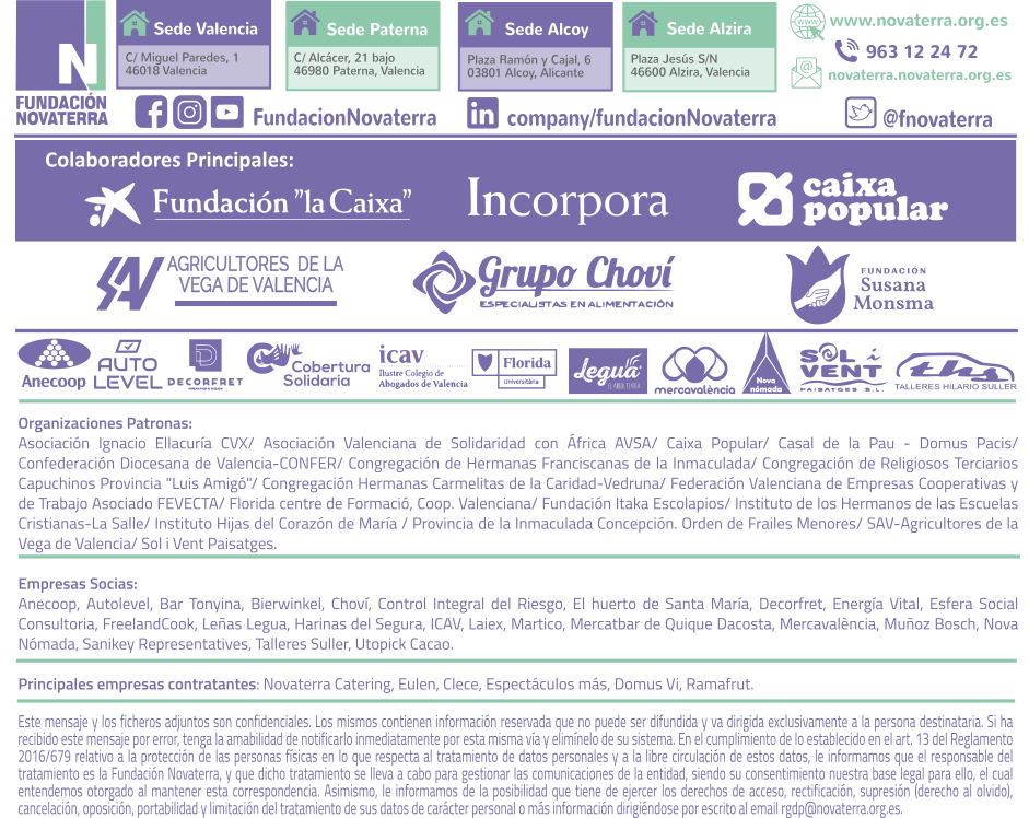 El impacto de la Fundación Novaterra en 2021 Sólo en 2021, un total de 839 personas ha sido contactadas por la Fundación Novaterra (a través de sus sedes de Alcoy, Alzira y Valencia) para ofrecerles servicios de formación, orientación e intermediación. De ellas, 627 han sido atendidas, 300 han iniciado su